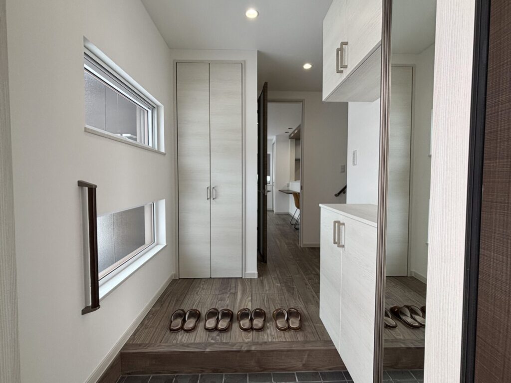 下駄箱収納とコート掛けがあるので玄関周りもスッキリ使えます。
