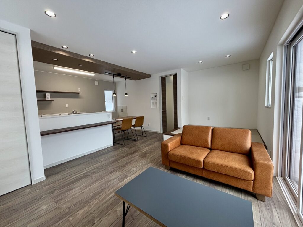 リビング。同じ空間ながら上手に仕切られており、明るくゆったりした空間となっております。