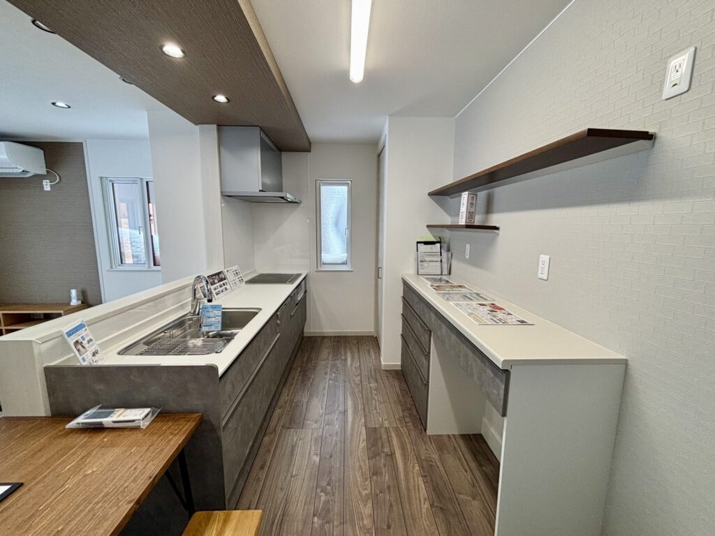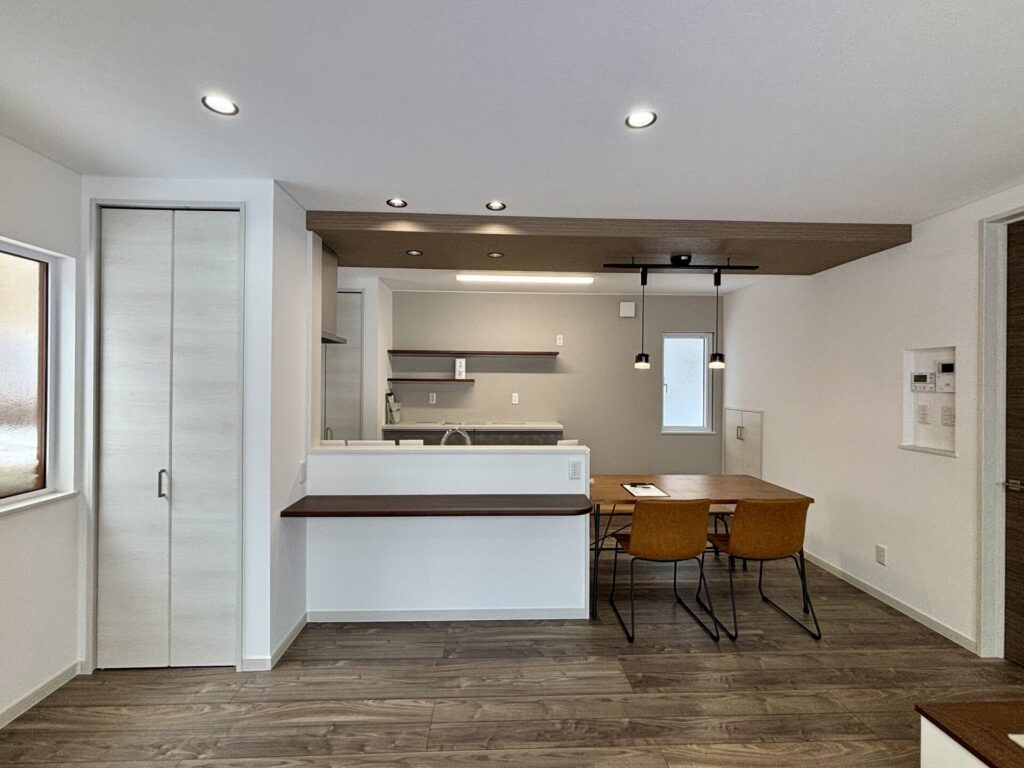 あると嬉しいキッチンカウンター付き。アクセントの下がり天井造作も映えます。
