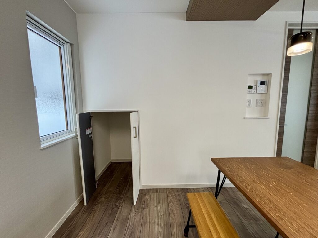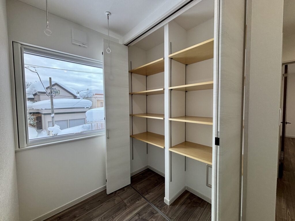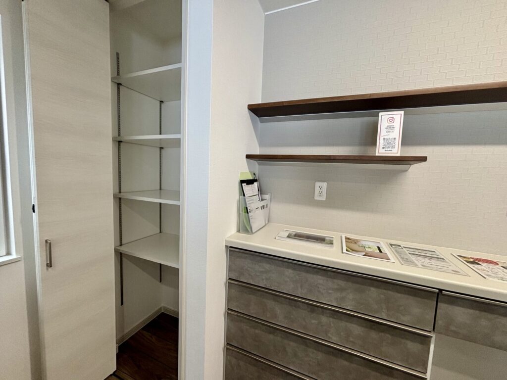 フリースペース横、用途多彩な収納スペース。棚の高さの調整可能です。